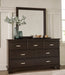 | Details | B441B8: Includes panel headboard, footboard, rails and slats, Made with hardwood solids, engineered wood veneer and MDF substrates, Dark brown finish, Floating panel headboard, Picture frame footboard, Foundation/box spring required, sold separately , Mattress available, sold separately, Assembly required, B441B1: Includes dresser and mirror, Made with hardwood solids, engineered wood veneer and MDF substrates, Dark brown finish, Metal bar pulls with bright nickel-tone finish, 7 smooth-gliding drawers with dovetail construction and metal center guides, Drawer interiors are lined with a wood grain laminate for a clean, finished look, Top moulding on dresser, Mirror attaches to back of dresser, | |