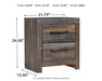 Details B211-46: Made of engineered wood (MDF/particleboard) and decorative laminate, Brown rustic finish with burnt orange and teal accents in a replicated wood grain with authentic touch, Large-scale hardware with dark finish, 5 smooth-gliding drawers, Drawer interiors are lined with a faux linen laminate for a clean, finished look, Includes tipover restraint device, Small Space Solution, Safety is a top priority, clothing storage units are designed to meet the most current standard for stability, ASTM F 2057 (ASTM International), Drawers extend out to accommodate maximum access to drawer interior while maintaining safety, B211-92: Made of engineered wood (MDF/particleboard) and decorative laminate, Brown rustic finish with burnt orange and teal accents in a replicated wood grain with authentic touch, 2 smooth-gliding drawers, Drawer interiors are lined with a faux linen laminate for a clean, finished look, Large-scale hardware with dark finish, 2 slim-profile USB-C charging stations, Power cord included; UL Listed, Small Space Solution, B211B1: Made of engineered wood (MDF/particleboard) and decorative laminate, Brown rustic finish with burnt orange and teal accents in a replicated wood grain with authentic touch, 6 smooth-gliding drawers, Drawers lined with faux linen laminate, Dark-tone industrial hardware, Mirror attaches to back of dresser, Assembly required, Includes tipover restraint device, B211B53: Includes bookcase headboard, footboard and rails, Made of engineered wood (MDF/particleboard) and decorative laminate, Brown rustic finish with burnt orange and teal accents in a replicated wood grain with authentic touch, Headboard includes a dimming LED light; 3 open cubbies, Foundation/box spring required, sold separately, Mattress available, sold separately, Assembly required, Bed is compatible with an adjustable base,