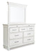 | Details | B777B4: Includes queen upholstered headboard, panel footboard and rails, Made with solid wood, veneers and engineered wood, Distressed whitewash finish, Button tufted fabric upholstery, Nailhead trim, Foundation/box spring required, sold separately, Mattress available, sold separately, Assembly required, B777B1: Includes dresser and mirror, Made with solid wood, veneers and engineered wood, Distressed whitewash finish, Dark gray pewter-tone finished metal hardware, 7 smooth-gliding drawers, plus 2 small-scaled accessory drawers, Mirror attaches to back of dresser, Assembly required, B777-46: Made with solid wood, veneers and engineered wood, Distressed whitewash finish, Dark gray pewter-tone finished metal hardware, 7 smooth-gliding drawers, B777-93: Made with solid wood, veneers and engineered wood, Distressed whitewash finish, Dark gray pewter-tone finished metal hardware, 2 smooth-gliding drawers, plus 1 small-scale top accessory drawer, | |