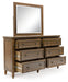 | Details | B787B2: Includes upholstered headboard, panel rails and bench footboard with slats, Made with hardwood solids, veneers and MDF substrates, Brown finish, Polyester upholstery, Nailhead trim, Turned feet, Foundation/box spring required, sold separately , Mattress available, sold separately, Assembly required, B787B1: Includes dresser and mirror, Made with hardwood solids, veneers and MDF substrates, Brown finish, Oil-rubbed bronze-tone knobs, 6 drawers with fully finished interior, dovetail construction and heavy duty ball-bearing side glides (top drawers felt lined), Turned feet, Mirror attaches to back of dresser, B787-93: Made with hardwood solids, veneers and MDF substrates, Brown finish, Oil-rubbed bronze-tone knobs, 2 drawers with fully finished interior, dovetail construction and heavy duty ball-bearing side glides (top drawer felt lined), Turned feet, 110V power supply with USB-A and USB-C charging ports, Power cord included; UL Listed, | |