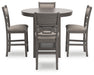 | Details | Includes counter height dining table and 4 upholstered bar stools, Table made with rubberwood solids, mindi veneer and MDF substrates, Stool made with solid wood and engineered wood, Light gray finish, Tabletop has reverse diamond patterned veneer, Thick tapered legs, 2 lower shelves, Stool with light gray textured polyester upholstery, Foam cushioned seat and backrest, Stool backrest features fretwork accent, Seats up to 4, Assembly required | |