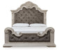Inspired by the grandeur and grace of European traditional style, this opulent king upholstered panel bed is nothing short of stunning. Ornate sculptural details and button-tufted fabric on the impressive headboard and footboard are sure to make a sophisticated statement in your restful retreat. A timeless antiqued white coloration lends an air of subtle elegance to this sumptuous bed.