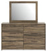 Casually cool style and lots of storage go hand in hand with this dresser and mirror. A weathered brown finish over replicated oak grain creates an easygoing vibe, setting the scene in your restful retreat. Clean lines and modern handles provide a fuss-free look. And the dresser's six roomy drawers give you plenty of space for stowing away clothes and more.