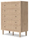 Clean-lined and contemporary—but far from stark—this chest of drawers is a fresh style awakening. Pairing a light finish with replicated oak grain and textured beige details that replicate the look of cane, its mixed materials bring a naturally versatile vibe to your bedroom. Sleek, simple hardware plays perfectly with the modern aesthetic. Prepare to have your mind blown by the vast universe of possibilities that await within the spacious drawers.