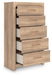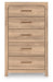 The natural wood tones and clean lines of this chest of drawers echo your easygoing style sensibilities. With a warm finish and replicated oak grain, its carefree character lightens up your bedroom. Curved inner corner details soften the look, while sleek bronze-tone hardware modernizes the feel.
