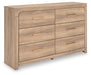 The natural wood tones and clean lines of this dresser echo your easygoing style sensibilities. With a warm finish and replicated oak grain, its carefree character lightens up your bedroom. Curved inner corner details soften the look, while sleek bronze-tone hardware modernizes the feel.