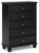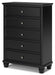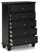 | Details | Made with hardwood solids, birch veneer and MDF substrate, Black painted finish, 5 smooth-gliding drawers with dovetail construction and ball-bearing side glides, Round metal drawer knobs with satin nickel-tone finish, Framed drawer fronts, Tapered feet | |