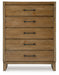 If you appreciate minimalistic style, this chest of drawers is the ideal option. Its soft and simple finish has a laid-back sensibility, blending relaxed contemporary design with a trendy allure. The spacious drawers are accented with stylish metal drawer pulls in a darkened bronze tone. What a delightful addition to your casual-chic decor.