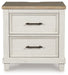 This nightstand elevates the art of modern farmhouse design. Its two-tone aesthetic blends antiqued white and light grayish brown for a charming finish. Two strikingly simple drawers lend a hand with conquering clutter, while AC power and two USB ports provide fast bedside charging. Conveying a feeling of relaxed comfort, the piece is sure to carry you away to a dreamy time and place.