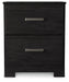 With its clean-lined look and modern attitude, this nightstand is a fresh style awakening. A warm charcoal hue over replicated oak grain easily complements other furniture finishes. Smooth drawer fronts with antiqued pewter-tone handles complete the aesthetic.