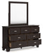 Details B441B9: Includes panel headboard, footboard, rails and slats, Made with hardwood solids, engineered wood veneer and MDF substrates, Dark brown finish, Floating panel headboard, Picture frame footboard, Foundation/box spring required, sold separately , Mattress available, sold separately, Assembly required, B441B1: Includes dresser and mirror, Made with hardwood solids, engineered wood veneer and MDF substrates, Dark brown finish, Metal bar pulls with bright nickel-tone finish, 7 smooth-gliding drawers with dovetail construction and metal center guides, Drawer interiors are lined with a wood grain laminate for a clean, finished look, Top moulding on dresser, Mirror attaches to back of dresser, B441-92: Made with hardwood solids, engineered wood veneer and MDF substrates, Dark brown finish, Metal bar pulls with bright nickel-tone finish, 2 smooth-gliding drawers with dovetail construction and metal center guides, Drawer interiors are lined with a wood grain laminate for a clean, finished look, Top moulding,