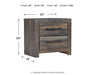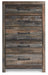 Details B211-46: Made of engineered wood (MDF/particleboard) and decorative laminate, Brown rustic finish with burnt orange and teal accents in a replicated wood grain with authentic touch, Large-scale hardware with dark finish, 5 smooth-gliding drawers, Drawer interiors are lined with a faux linen laminate for a clean, finished look, Includes tipover restraint device, Small Space Solution, Safety is a top priority, clothing storage units are designed to meet the most current standard for stability, ASTM F 2057 (ASTM International), Drawers extend out to accommodate maximum access to drawer interior while maintaining safety, B211-92: Made of engineered wood (MDF/particleboard) and decorative laminate, Brown rustic finish with burnt orange and teal accents in a replicated wood grain with authentic touch, 2 smooth-gliding drawers, Drawer interiors are lined with a faux linen laminate for a clean, finished look, Large-scale hardware with dark finish, 2 slim-profile USB-C charging stations, Power cord included; UL Listed, Small Space Solution, B211B1: Made of engineered wood (MDF/particleboard) and decorative laminate, Brown rustic finish with burnt orange and teal accents in a replicated wood grain with authentic touch, 6 smooth-gliding drawers, Drawers lined with faux linen laminate, Dark-tone industrial hardware, Mirror attaches to back of dresser, Assembly required, Includes tipover restraint device, B211B45: Includes bookcase headboard, footboard, 2 underbed storage units, rails and wood roll slats, Made of engineered wood (MDF/particleboard) and decorative laminate, Brown rustic finish with burnt orange and teal accents in a replicated wood grain with authentic touch, Footboard with 4 drawers and 4 open cubbies that each accommodate 10.5"W x 10.5"D x 11"H cube storage bin (not provided), Headboard includes a dimming LED light; 3 open cubbies, Dark-tone industrial hardware, Included slats eliminate need for foundation/box spring, Mattress available, sold separately, Assembly required,