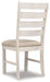 Details Made of wood and engineered wood, Distressed grayish white finish, Cushioned seat with polyester upholstery, Tall ladderback design, Assembly required