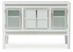 | Details | Made with solid wood components, MDF substrate and decorative PVC laminate, Bright white lacquer finish, 2 felt-lined drawers with fully finished interior, dovetail construction and ball-bearing side glides, 2 glass-front cabinets, each with adjustable shelf, Brushed champagne metal pulls, Rhinestone and textured PVC accents, LED accent lighting, Power cord included; UL Listed, Assembly required | |