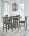 Cool and on-trend. This counter-height dining package sports an antiqued gray finish and gray textural fabric for a contemporary-yet-casual feel. The table features a storage base and removable leaf for extra seating room, making it a breeze to clear off clutter and expand your table space. Comfortably cushioned, the barstool features a padded seat, while its contoured comb-back design adds a dash of geometric flair. With this set, it's easy to dine in style.