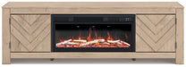 This TV stand with electric fireplace embraces a classically charming aesthetic and repurposes it for modern living. Its light replicated wood grain appeals to your love of vintage character, while the chic chevron pattern is effortlessly on trend. Media accessories stay tucked away in style with hidden storage behind the doors. And for added ambiance, the electric fireplace brings a cozy-cool vibe to your living room. With the touch of a button, activate the LED-lit flame and adjust the temperature or the flame brightness. The flame effect includes multiple color options and a realistic-looking faux birch log set.