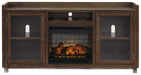 | Details | Includes XL TV stand and electric fireplace insert (W100-101), Made of acacia veneers, wood and engineered wood, Oiled walnut-tone finish, Dark bronze-tone metal hardware, 2 glass-front cabinets, each with an adjustable shelf; adjustable/removable center shelf, open cubby and cutouts for wire management and venting for heat, Electric fireplace insert provides up to 5,386 BTU/1,500W and warms up to 1,000 square feet (heats larger rooms), 7-level temperature setting; 5 levels of flame brightness, LED-lit multi flame display operates with or without infrared heat, Realistic-looking log set with dynamic glowing embers, Remote control with LED display, Timer function with programmable ranges from 10 minutes to 9 hours; overheating control device, Power cord included; UL Listed, Assembly required; simply remove the center shelf and back panel to make room for the fireplace insert | |