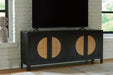 Details Made with wood and veneer, Black finish with light sandblasted effect, Woven cane door fronts, Metal door pulls with black finish, 4 doors with soft-close hinges, 2 shelves, Openings in back for electronics, Assembly required
