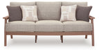 Natural neutrals are all the rage. Embrace the style trend with this outdoor sofa. Crafted with MEGA-TUFF® HDPE material, this chair combines the exceptional durability and weather resistance you need with the wood look you love. Comfy cushions wrapped in our high-performing, low-maintenance Nuvella® fabric offer stylish and durable appeal, taking outdoor living to a whole new level. Coordinating accent pillows add a wonderful layer of interest.