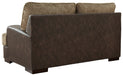 Punctuated by a subtle band of nailhead trim, this loveseat is perfect for those who love the look of leather. Two textural tones provide twice the style and comfort—and incorporate an added layer of visual interest. Throw pillows add a fun decorative element.