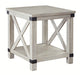 Sporting a distressed whitewash finish, this end table is rustic farmhouse living at its best. Crossbuck styling adds striking flair. Metal industrial brackets incorporate an industrial twist.