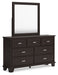 | Details | Includes dresser and mirror, Made with hardwood solids, engineered wood veneer and MDF substrates, Dark brown finish, Metal bar pulls with bright nickel-tone finish, 7 smooth-gliding drawers with dovetail construction and metal center guides, Drawer interiors are lined with a wood grain laminate for a clean, finished look, Top moulding on dresser, Mirror attaches to back of dresser | |