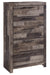 Modern yet hefty. This chest of drawers makes an urban eclectic statement. Seasoned raw wood look merges with the clean lined design we love today. Muted rustic finish over replicated pine grain maintains its authenticity. Roomy drawers are flanked with attractive framed front and pilasters. Handles with antiqued gunmetal finish complete this beauteous look with easy to pull function.