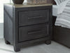 This nightstand is casual contemporary style simply done right. Its two-tone color scheme features a rich brushed black main color accented with a beautiful dusty grayish brown wood tone. Two drawers with sleek black pulls offer plenty of storage for your bedside essentials. The nightstand marries tech and clean-lined design, with a dual USB charging port along the upper back edge to keep your devices powered all evening long.