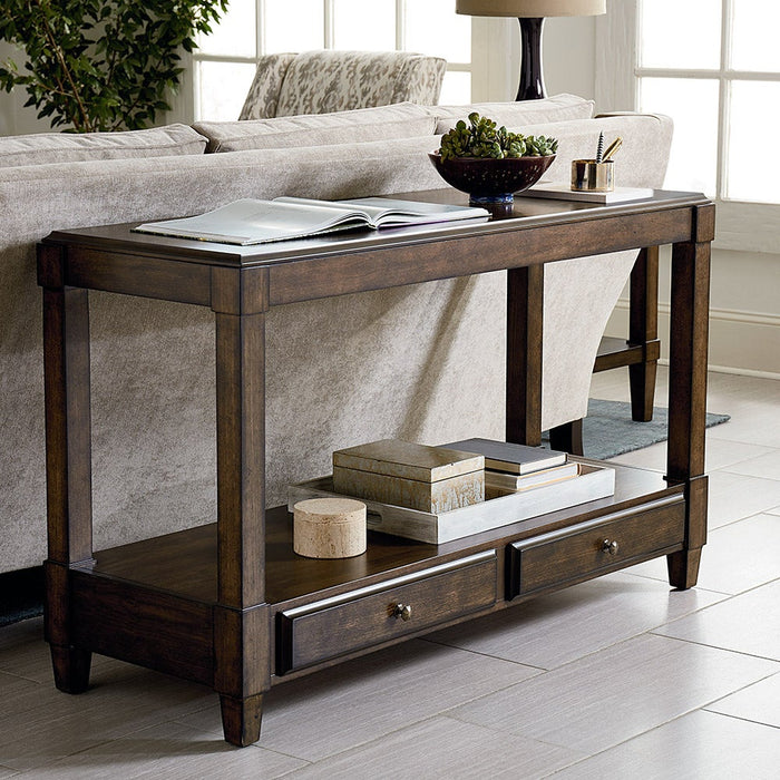 The Halsey Sofa Table presents a harmonious blend of functionality and elegance, offering organized storage with its two drawers and convenient lower shelf. Crafted with precision from Walnut Veneers and Select Hardwoods, this piece exudes sophistication while seamlessly complementing a variety of interior aesthetics.