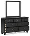 Details Includes dresser and mirror, Made with hardwood solids, birch veneer and MDF substrate, Black painted finish, 7 smooth-gliding drawers with dovetail construction and ball-bearing side glides, Round metal drawer knobs with satin nickel-tone finish, Framed drawer fronts, Tapered feet, Mirror attaches to back of dresser, Assembly required