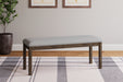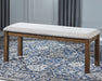 This upholstered dining bench elevates the art of casual rustic style. With a distressed nutmeg finish, antiqued nailhead trim and textured polyester fabric, this upholstered dining bench entices with warmth and earthy elegance. Cushioned seat accommodates lingering meals enjoyed in comfort.