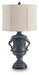 | Details | Made of polyresin with drum bell fabric shade, Antiqued black finish, 3-way switch, 1 E26 socket, type A bulb recommended (not included); 150 watts max or LED equivalent; UL Listed, Minor assembly required; simply attach preassembled shade to lamp base | |