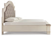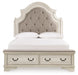 | Details | Queen upholstered bed (headboard, footboard and panel rails with roll slats), Made with engineered wood and poplar solids, with cast resin components, Chipped white finish, Drawers with dovetail construction and ball bearing side glides, Dark bronze-tone hardware, Footboard with cushioned top rail, Headboard with inset upholstered cushion, Bed does not require additional foundation/box spring; accommodates most zero clearance adjustable bases with the addition of a bunkie board, Mattress sold separately, Assembly required, Expert assembly recommended; available at check out for an additional fee | |