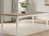 Bon appétit. This dining room extension table has all the right ingredients for a French country-inspired feast for the eyes. Antiqued two-tone aesthetic pairs a chipped white with a distressed wood finished top for a double serving of charm. Drop-in leaf allows you to comfortably accommodate eight.