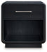 Details Made with hardwood solids and ash veneer, Black finish on textured wood grain surface, Brushed nickel-tone pulls, Waterfall edges, Smooth-gliding drawer with fully finished interior, dovetail construction and heavy duty ball-bearing side glides, Lower cubby shelf with built-in LED nightlight, 110V power supply with USB-A and USB-C charging ports, Power cord included; UL Listed