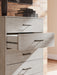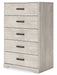 Give casual a new meaning with the chic look of the Shawburn chest of drawers. A light gray finish over replicated oak grain keeps it laid-back and inviting, while substantial pulls in a warm pewter tone add a modern farmhouse touch. Spacious drawers give you plenty of room to store your wardrobe. Talk about a delightfully relaxed vibe in your inner sanctum.