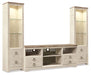 | Details | Includes 3 pieces: TV stand and 2 piers, Made with engineered wood (MDF/particleboard) and decorative laminate, Replicated whitewash and wood grained block pattern with authentic touch, Antiqued brass-tone ring-pull hardware, 2 drawers, 2 media cubbies, cutouts for wire management and removable center shelf, Piers with LED lighting, 4 adjustable glass shelves and 2 cabinets, each with an adjustable shelf; cabinet doors open to the left, Assembly required | |